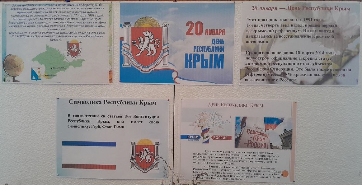 В этот день, 20 января 2026 года, в отделении «Активное долголетие» и отделении дневного пребывания граждан пожилого возраста и инвалидов с. Калинино ГБУ РК «ЦСО «Первомайского района», были проведены информационные часы, посвященные дню Республики Крым. Подопечные отделений слушали рассказы об истории полуострова, о традициях этого праздника в современном Крыму, с интересом принимали участие в увлекательных викторинах о родном полуострове и делились рассказами и воспоминаниями о своих самых любимых уголках Крыма. В отделении дневного пребывания граждан пожилого возраста и инвалидов с. Калинино ГБУ РК «ЦСО «Первомайского района» был подготовлен информационный стенд, посвященный празднику.